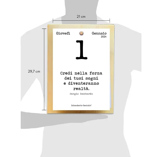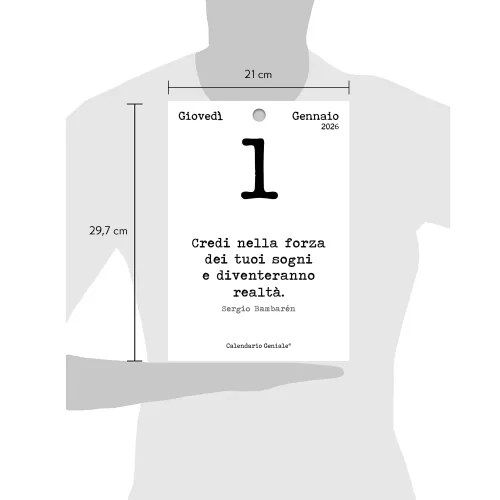Ogni giorno un nuovo foglio t’invita a focalizzarti su una frase d’ispirazione per far riaffiorare un ricordo, un pensiero positivo per la giornata, un’idea nuova da realizzare o semplicemente ritrovare la pace interiore. I bambini lo adorano, i grandi condividono le frasi sui social, c’è chi le conserva per usarle in un secondo momento o per rileggerle con la persona del cuore. Il Calendario Geniale® unisce e crea armonia.